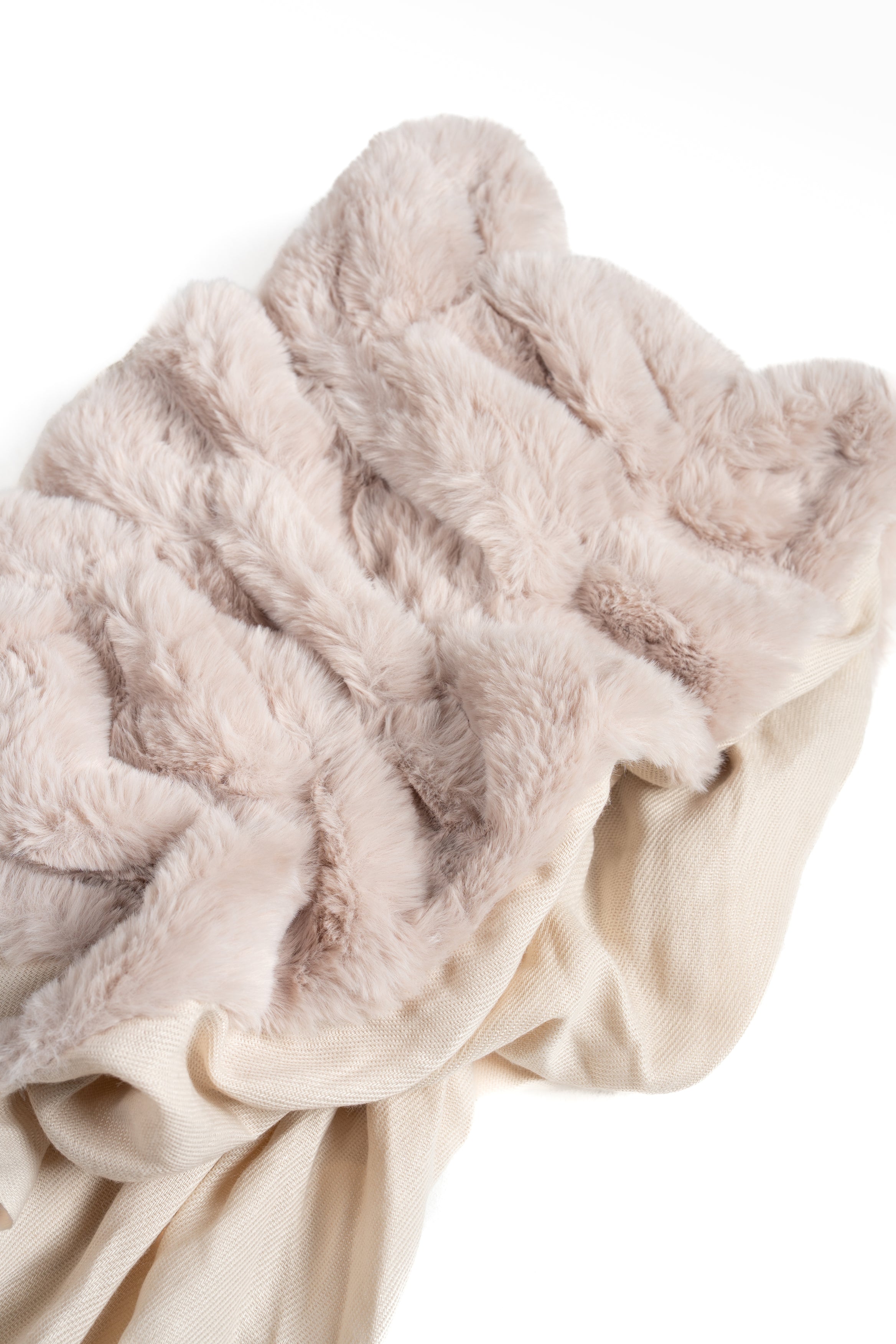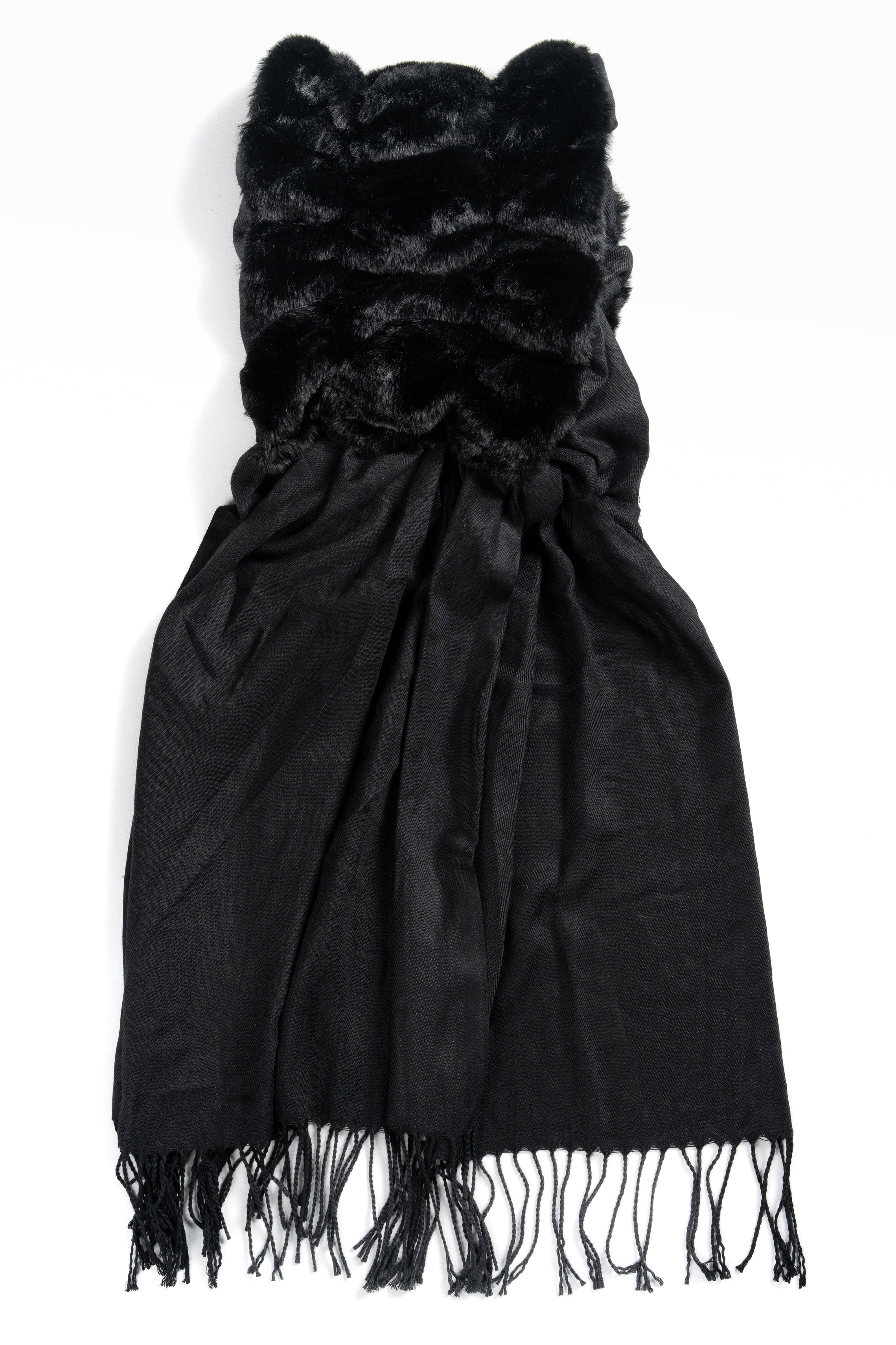 Sciarpa da donna con collo in pelliccia e parte inferiore liscia, rifinita con frange alle estremità.