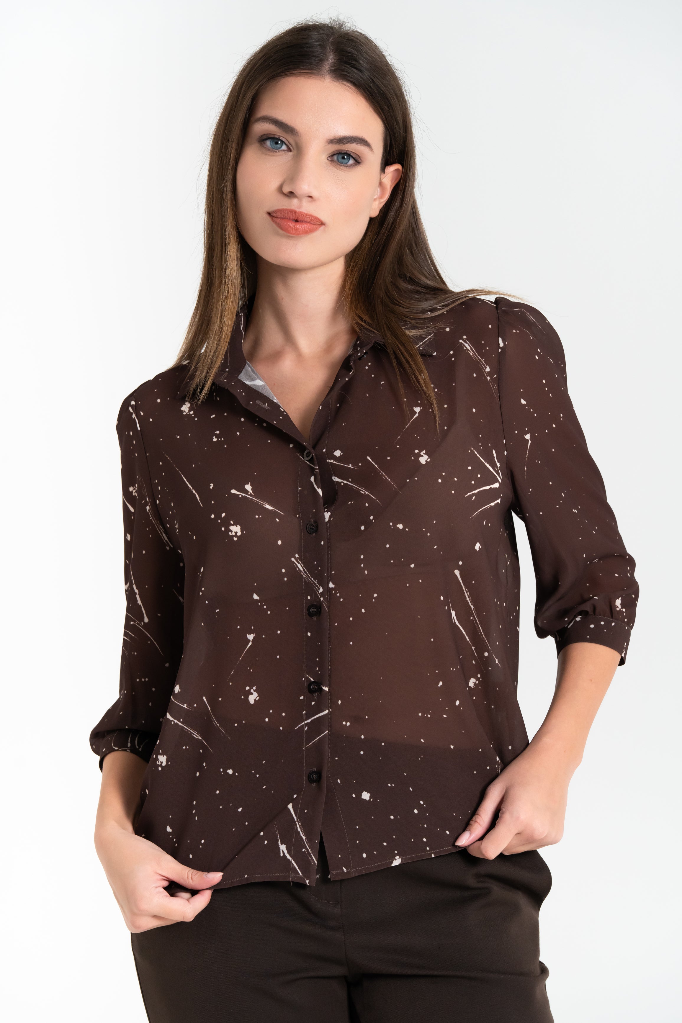 Camicia da donna stampata, con maniche a tre quarti, colletto classico e chiusura frontale con bottoni.