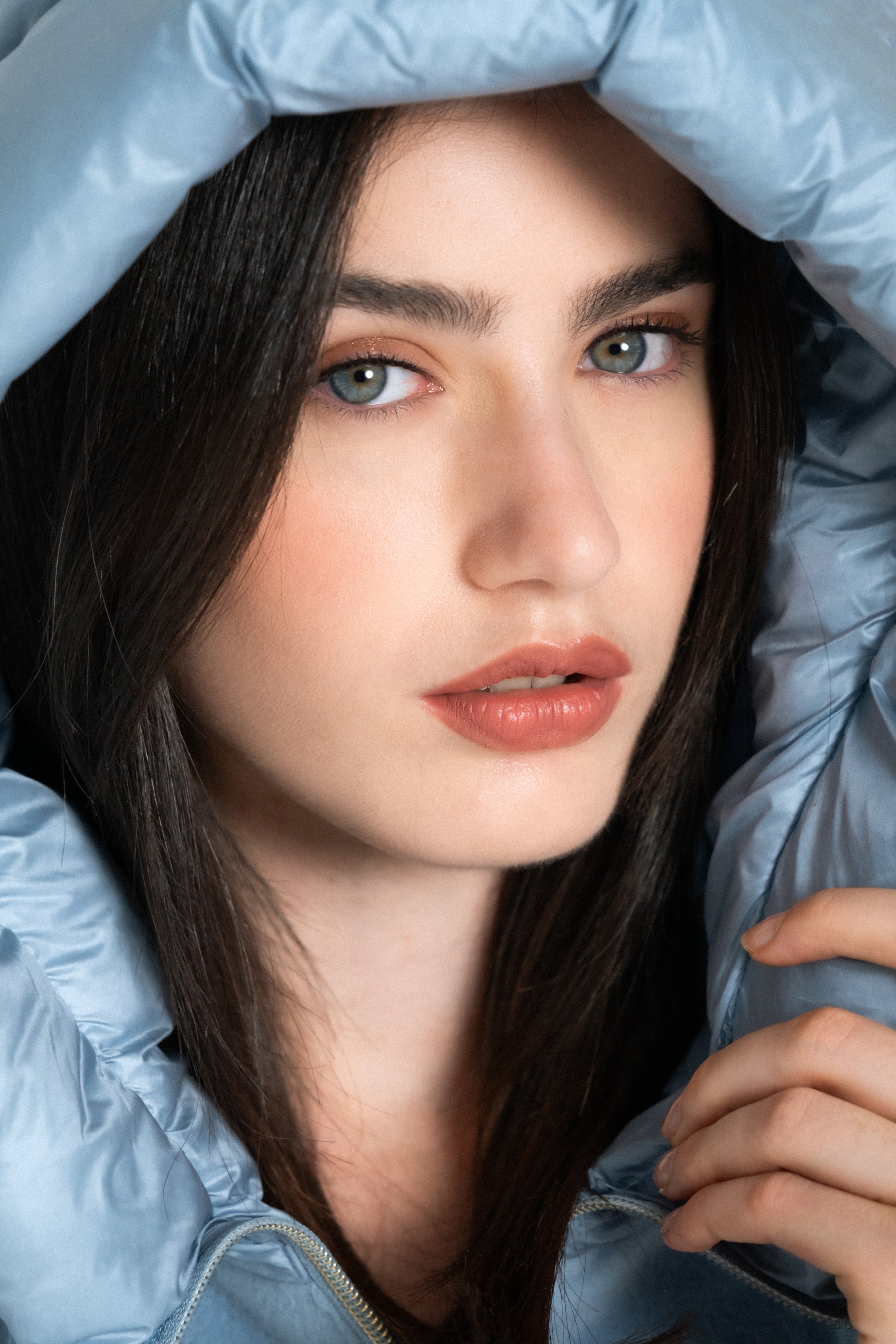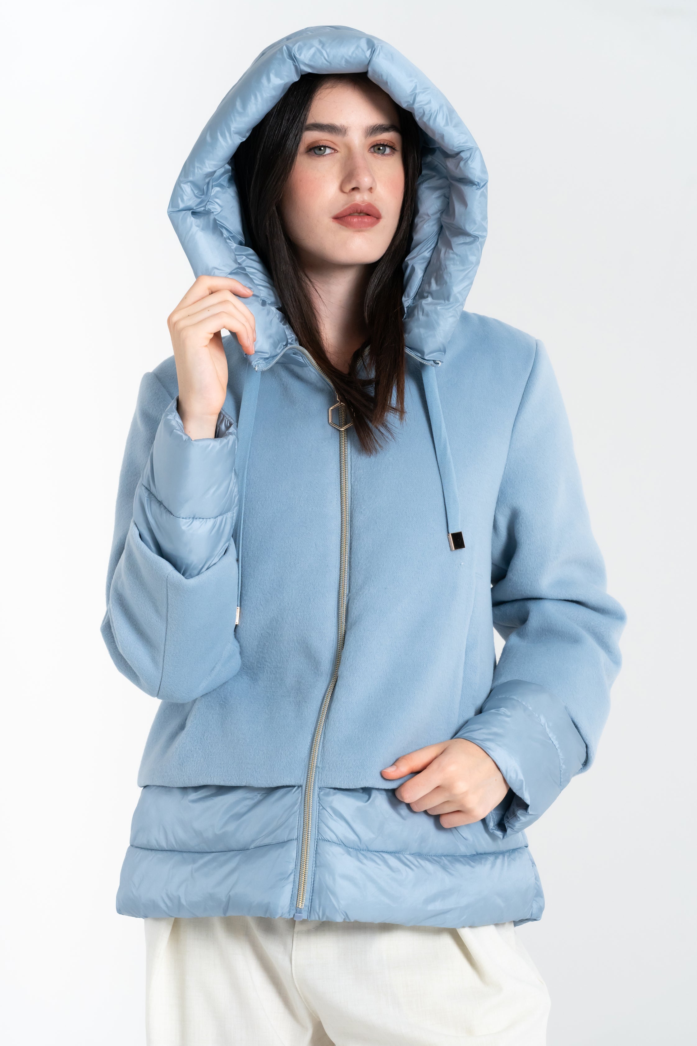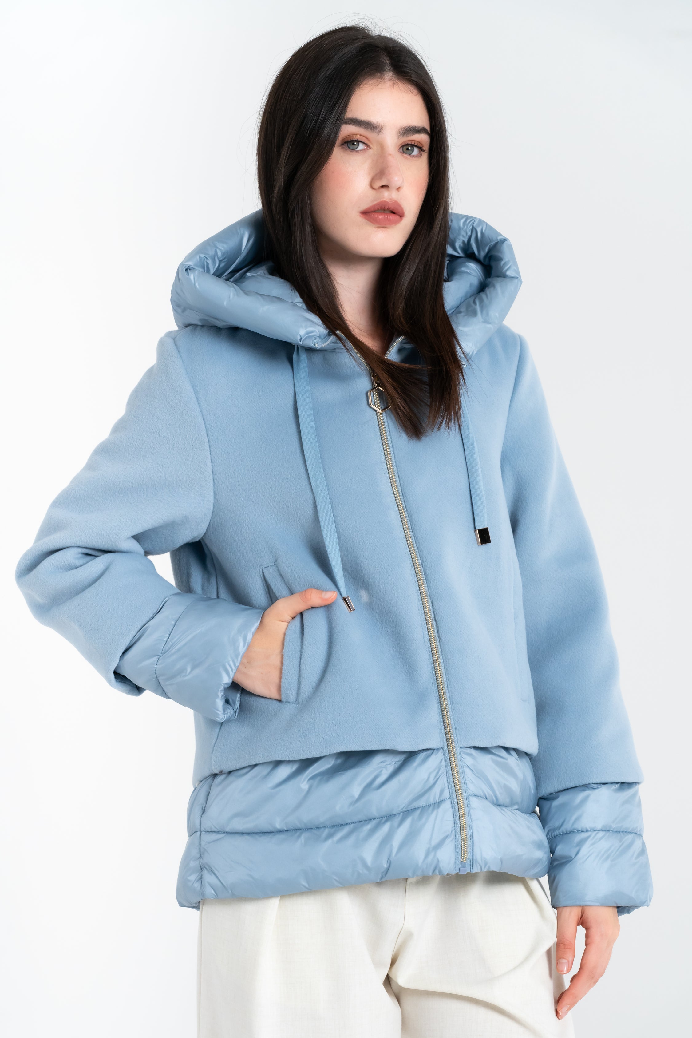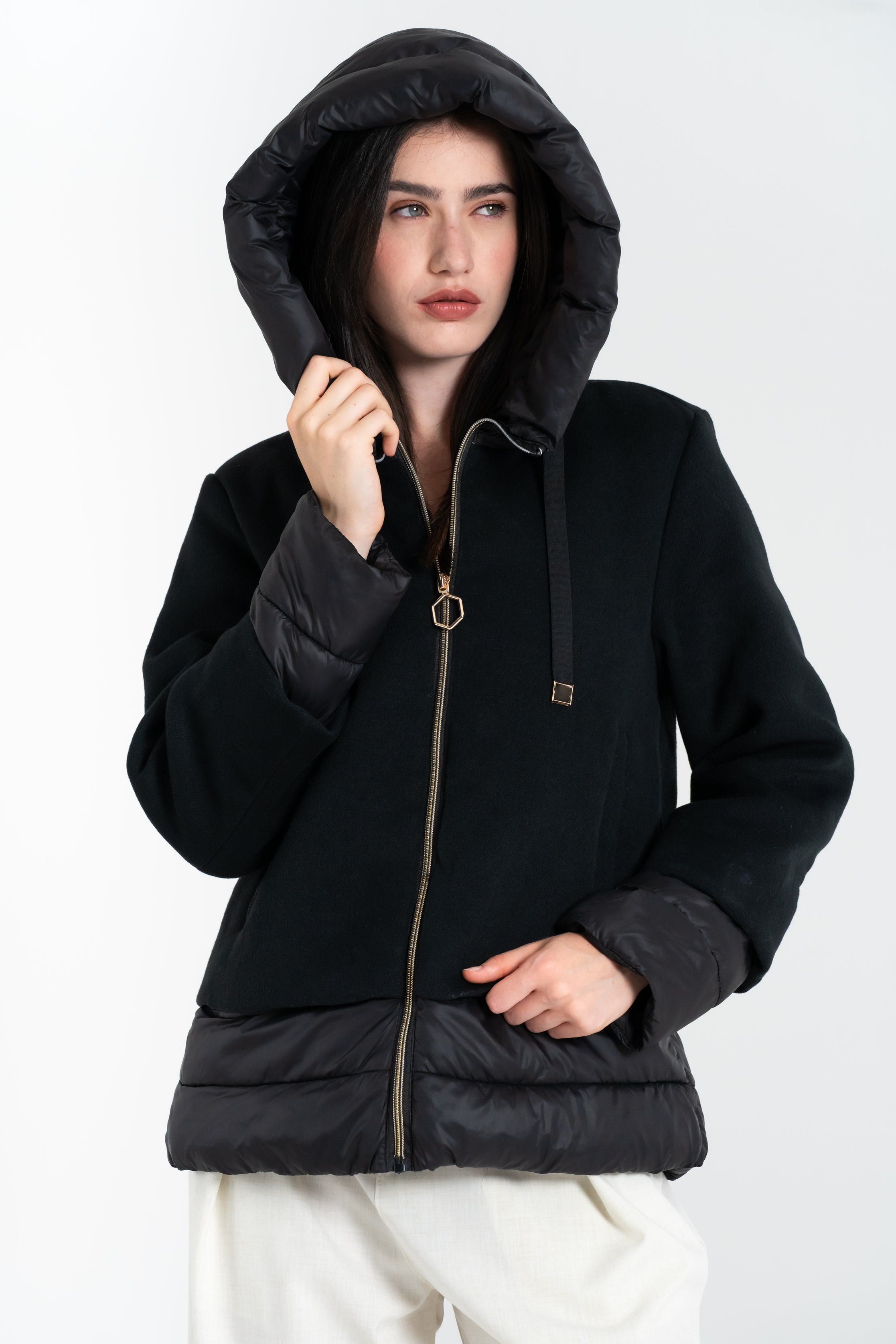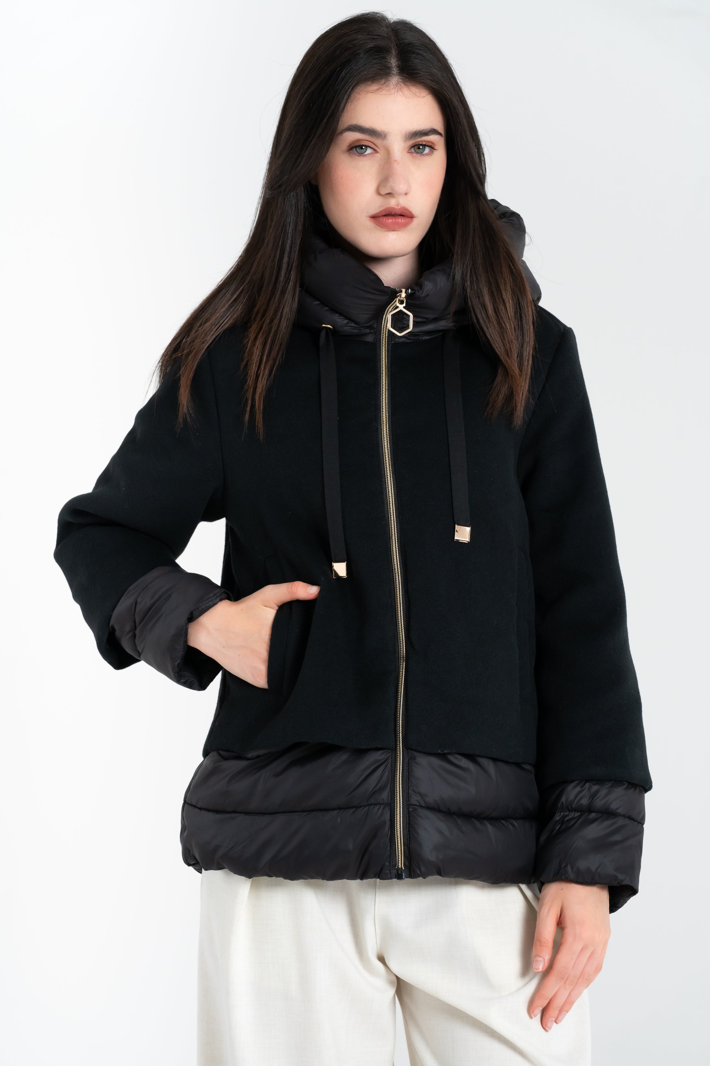 Piumino con inserti in panno, collo alto, cappuccio integrato, tasche laterali aperte e chiusura frontale con zip.