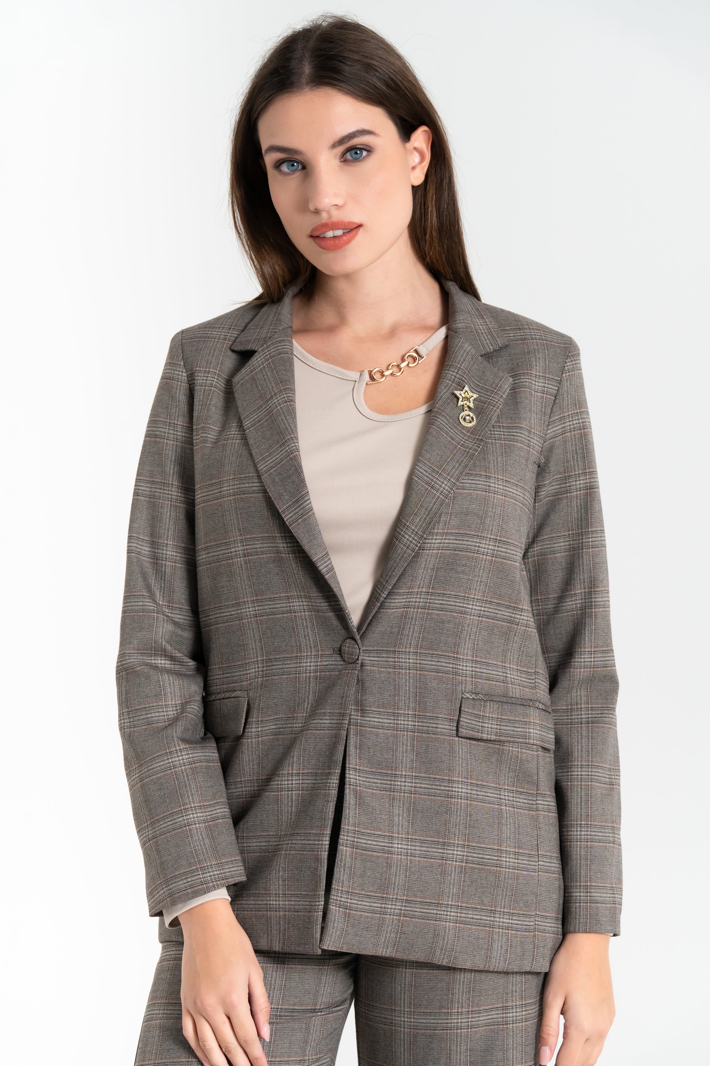 Giacca blazer da donna in fantasia scozzese, impreziosita da una spilla applicata sul colletto.