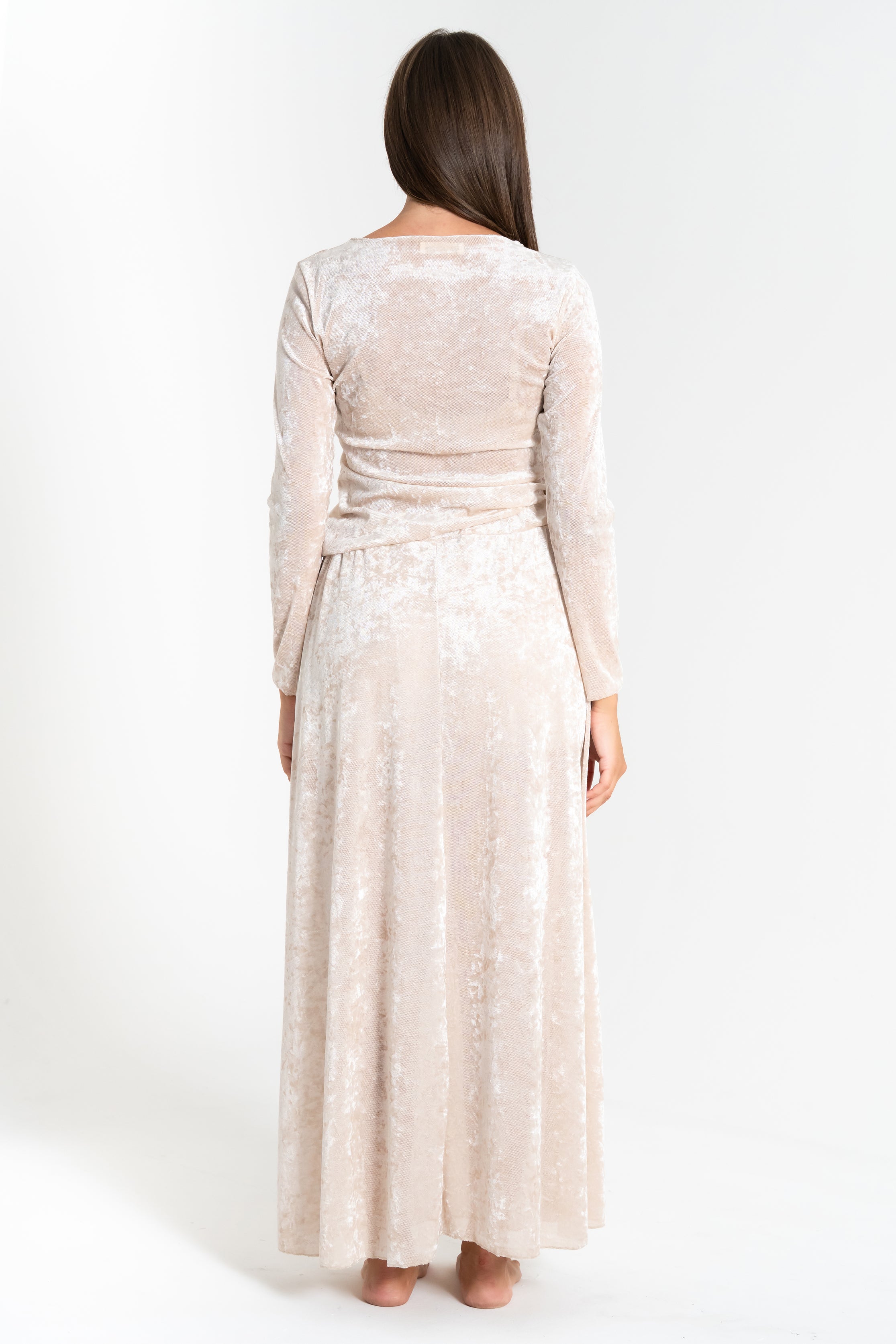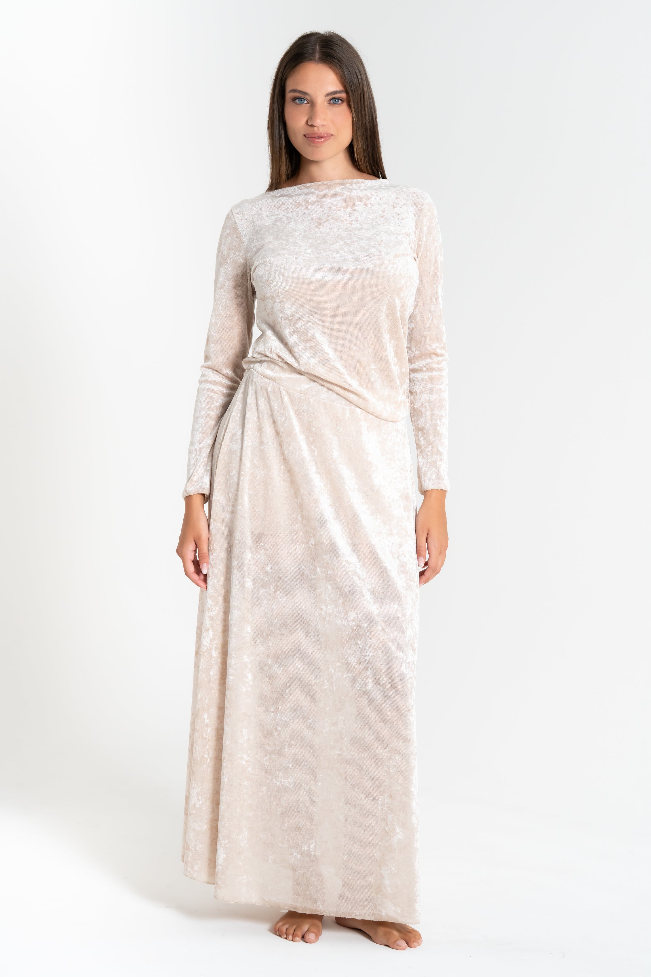 Gonna lunga da donna realizzata in morbida ciniglia, con vita elasticizzata e culotte interna.