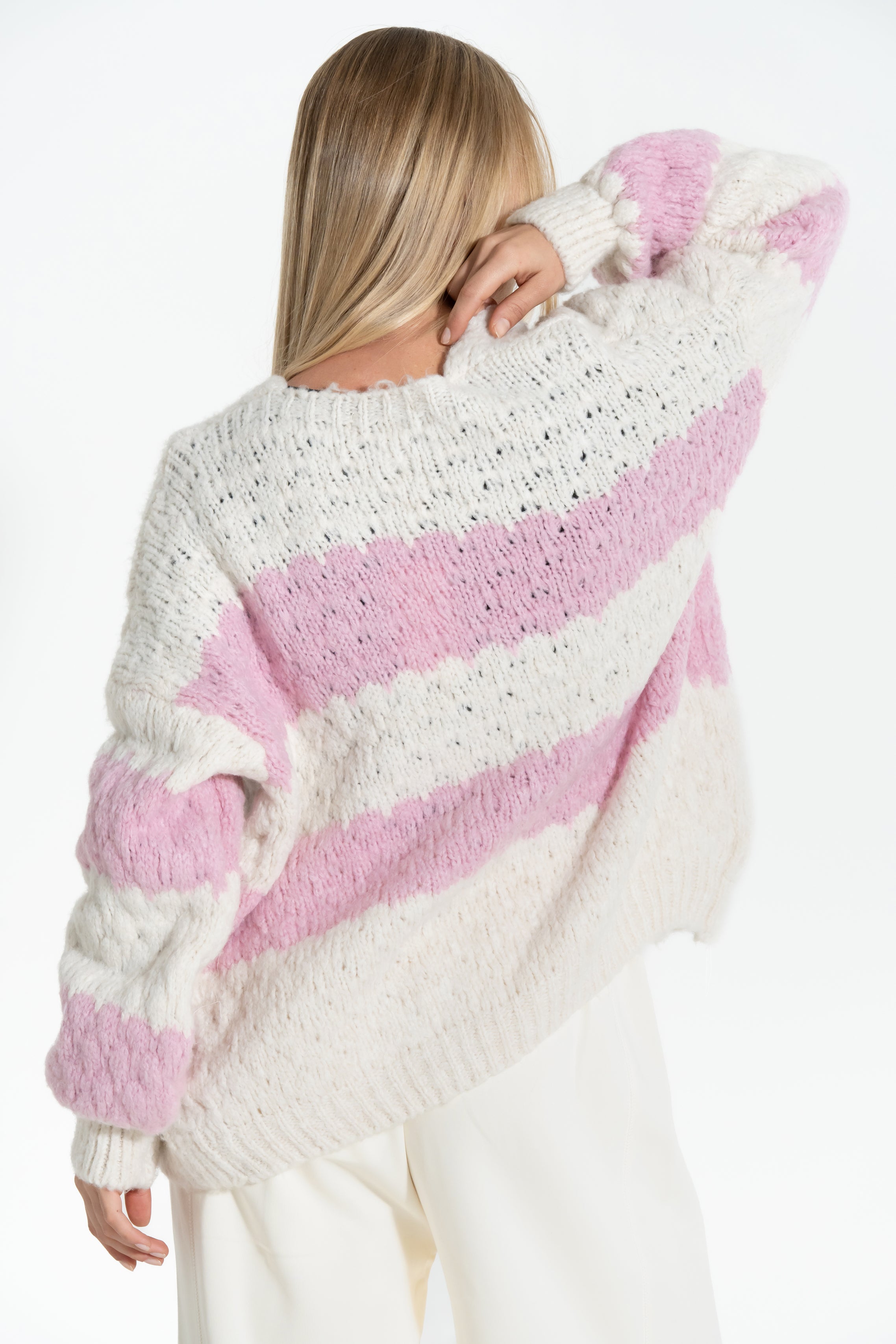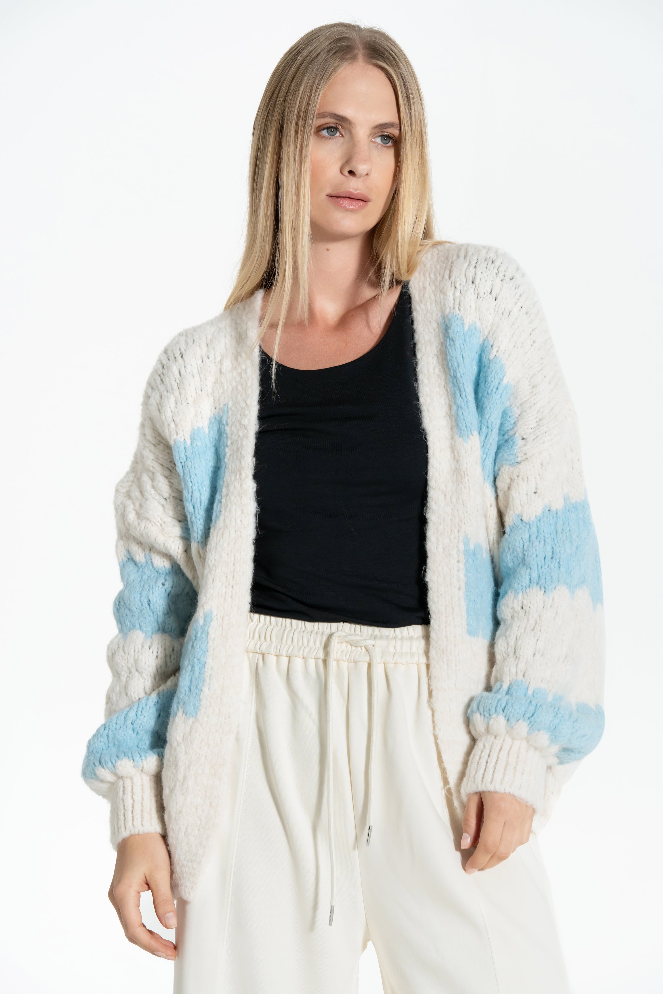 Cardigan aperto da donna in lana, con manica a sbuffo e polsino in fondo. Fantasia a righe.