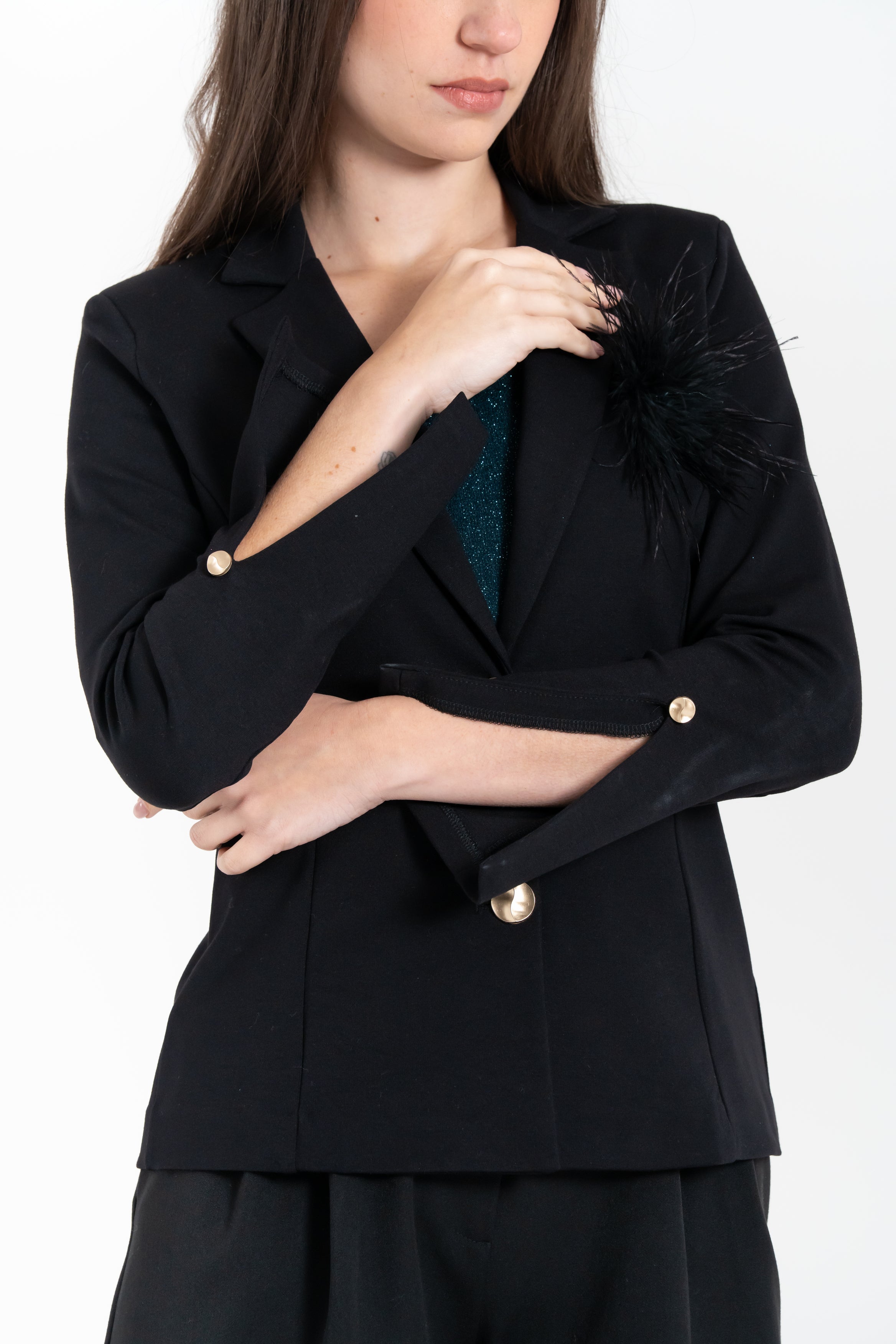 Giacca da donna in punto Milano, modello monopetto con rever classico, chiusura con bottoni e linea leggermente sagomata. Arricchita da una spilla decorativa in piuma.