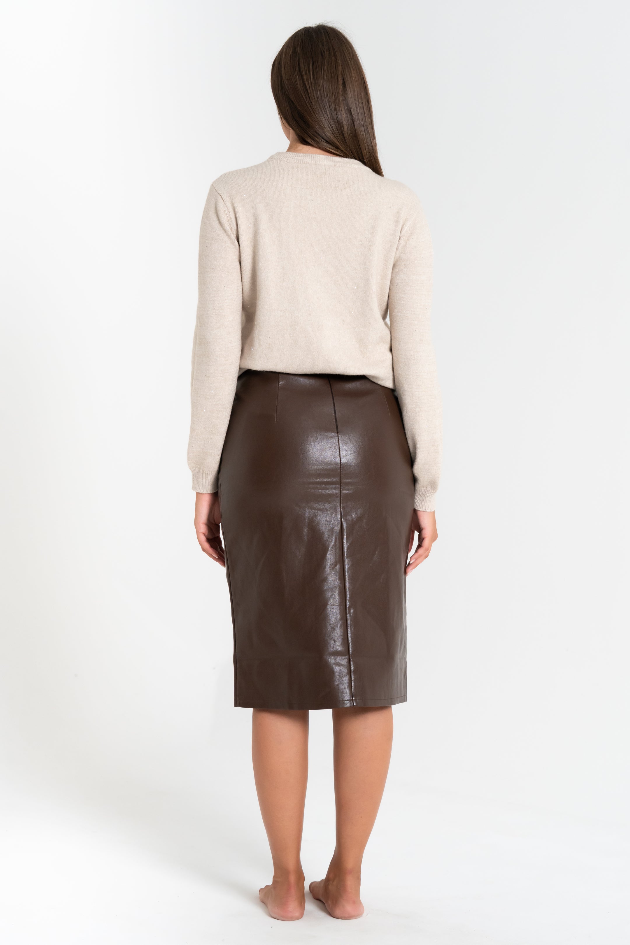 Gonna in ecopelle donna, vita alta, spacco laterale sul davanti, chiusura zip sul retro.