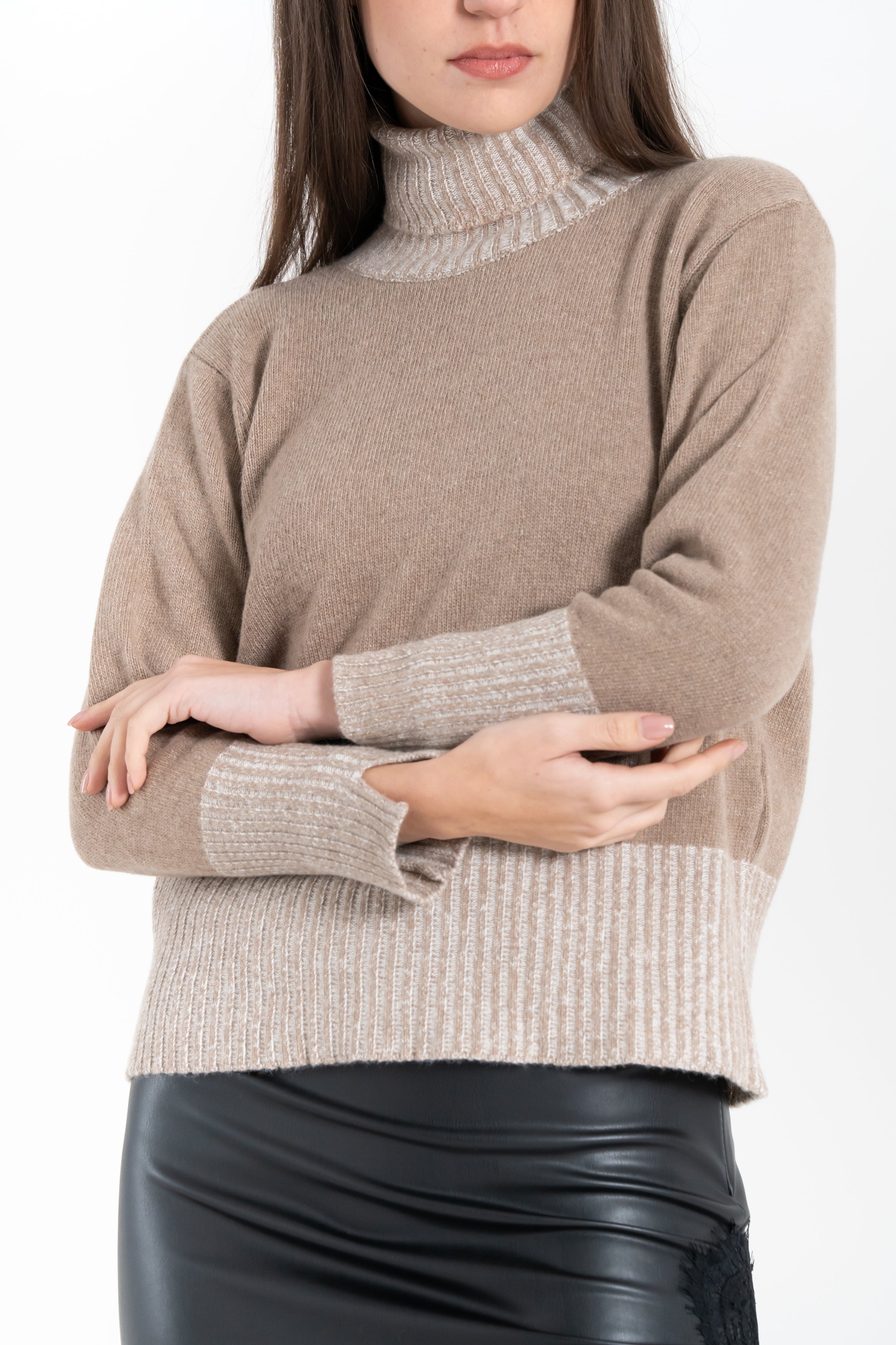 Dolcevita da donna, presenta collo alto a coste, maniche lunghe e vestibilità slim che valorizza la silhouette. I profili a contrasto su collo, polsini e fondo aggiungono un tocco raffinato.