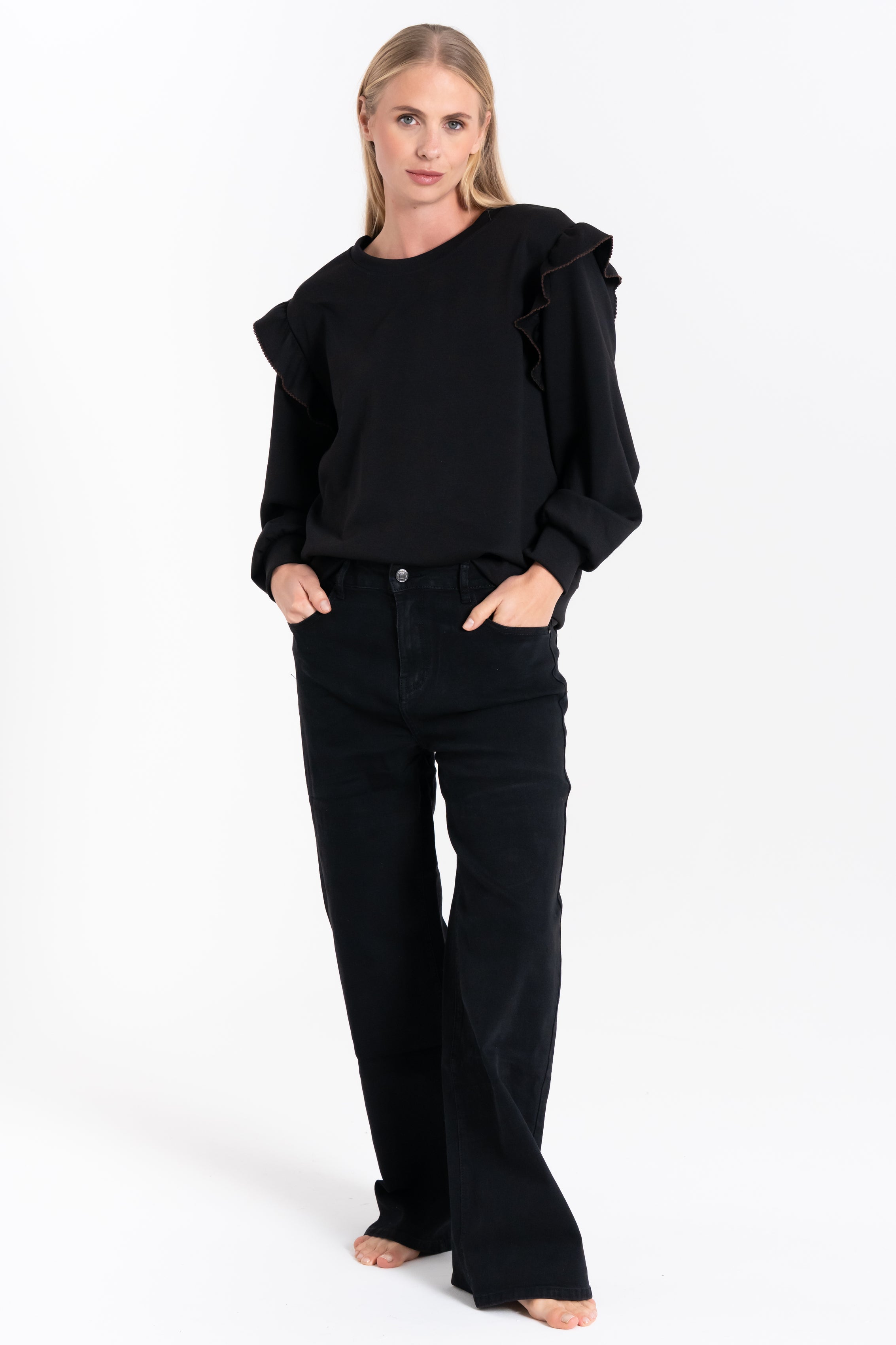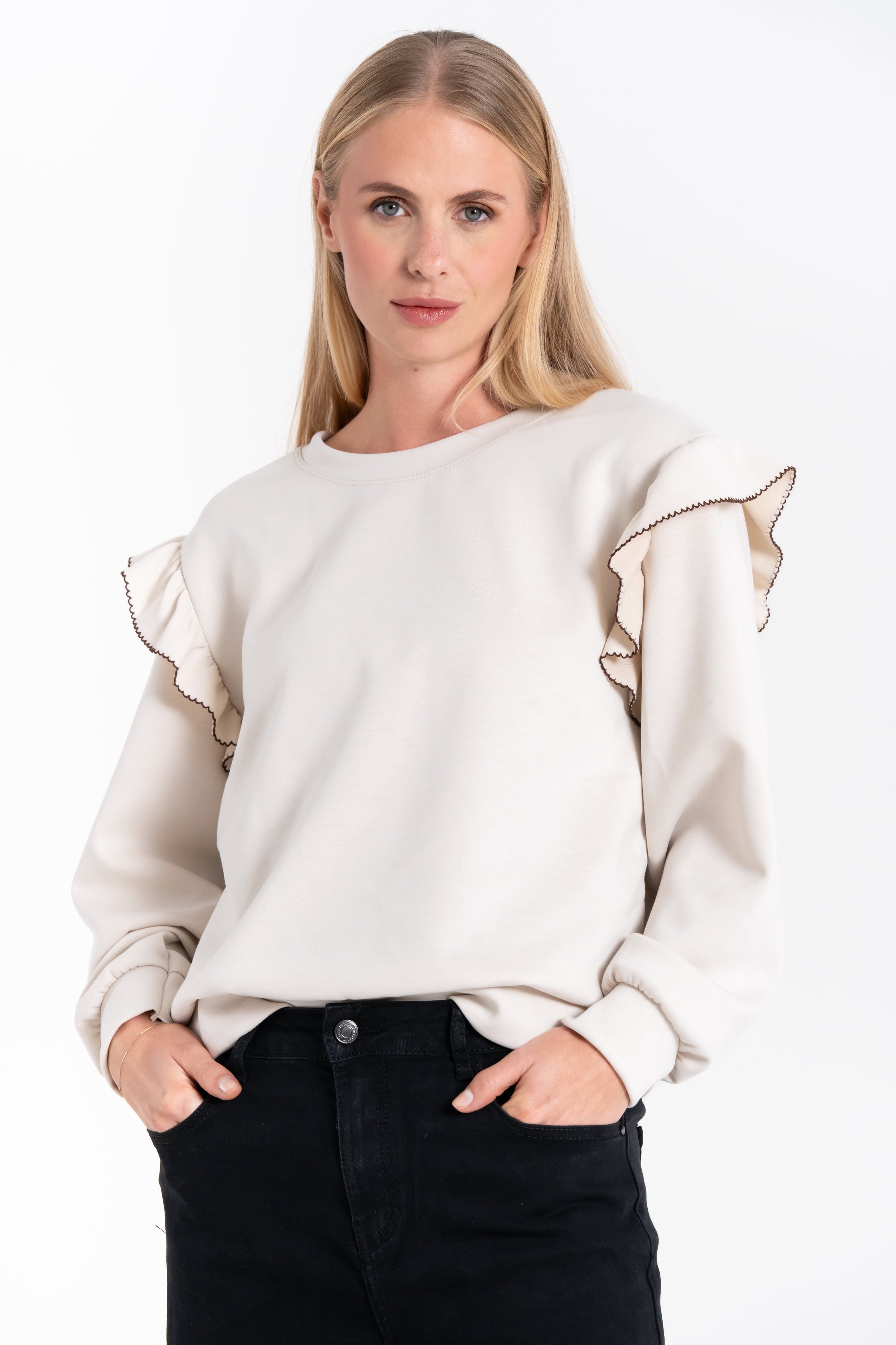 Maglia da donna a maniche lunghe, girocollo, arricchita da balze sulle spalle e rifinita con polsino al fondo della manica.