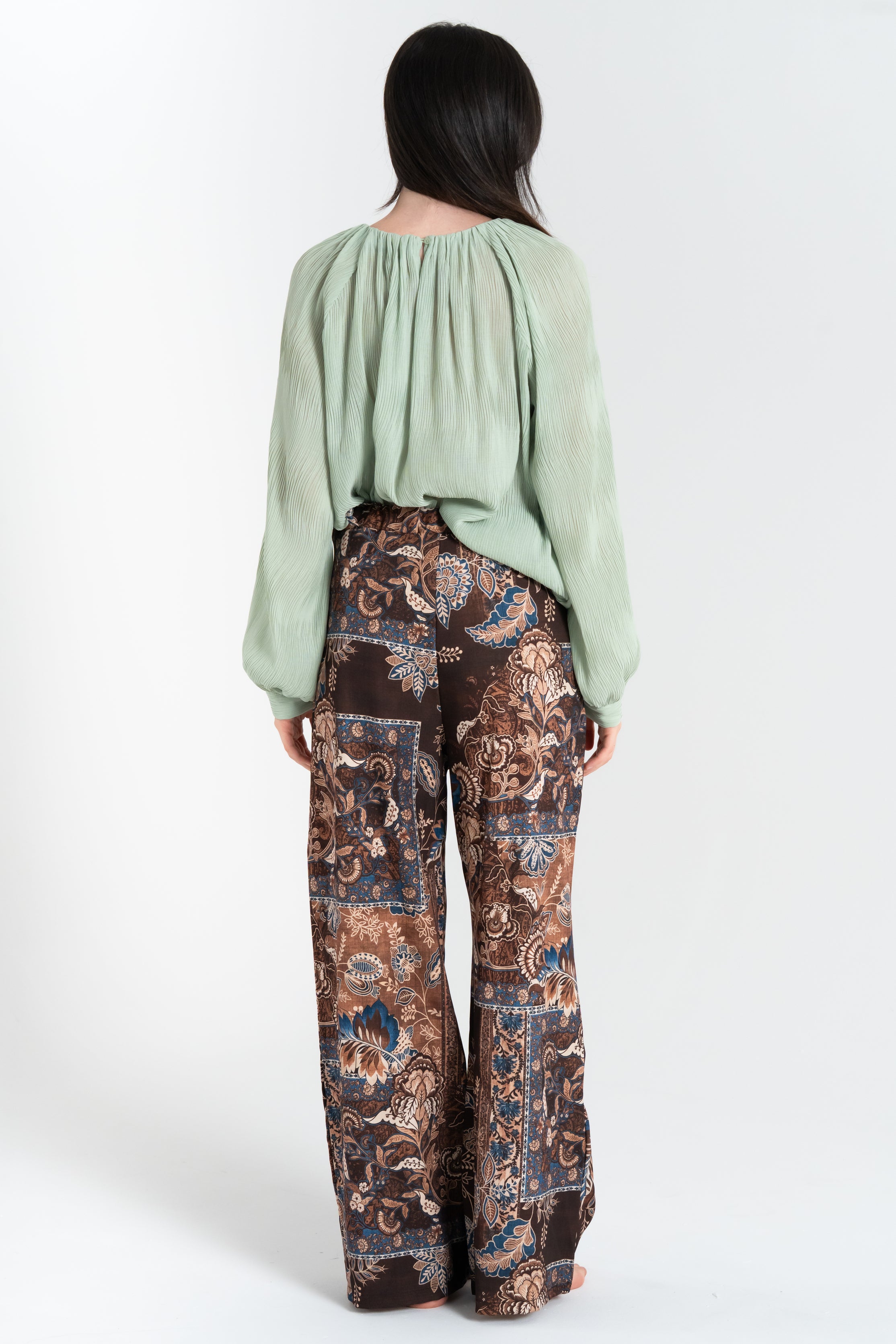 Pantalone lungo da donna con fantasia cachemire, dotato di tasche laterali aperte, chiusura frontale con bottone e zip, e fascia elastica sul retro della vita per un comfort ottimale.
