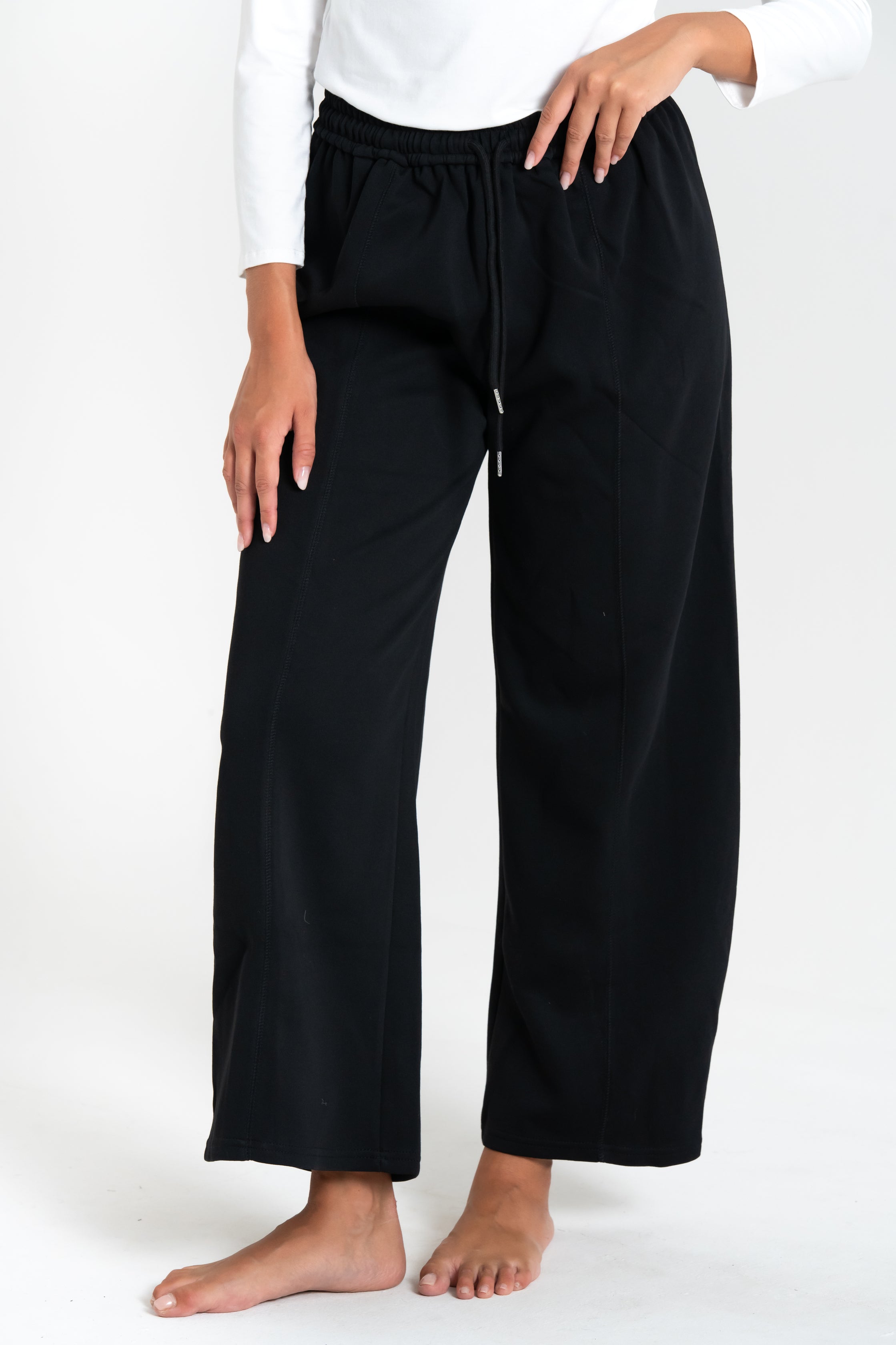 Pantalone da tuta a palazzo, comodo e ampio. Vita elasticizzata con cordino per una vestibilità regolabile.
