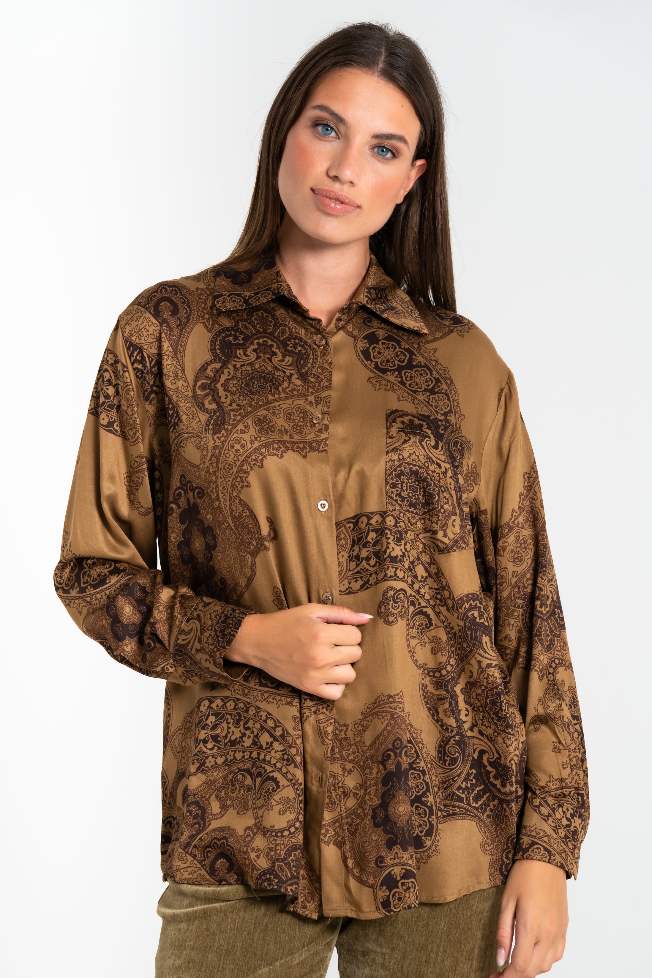 Camicia da donna in viscosa, a manica lunga, con fantasia, colletto classico e chiusura frontale con bottoni.
