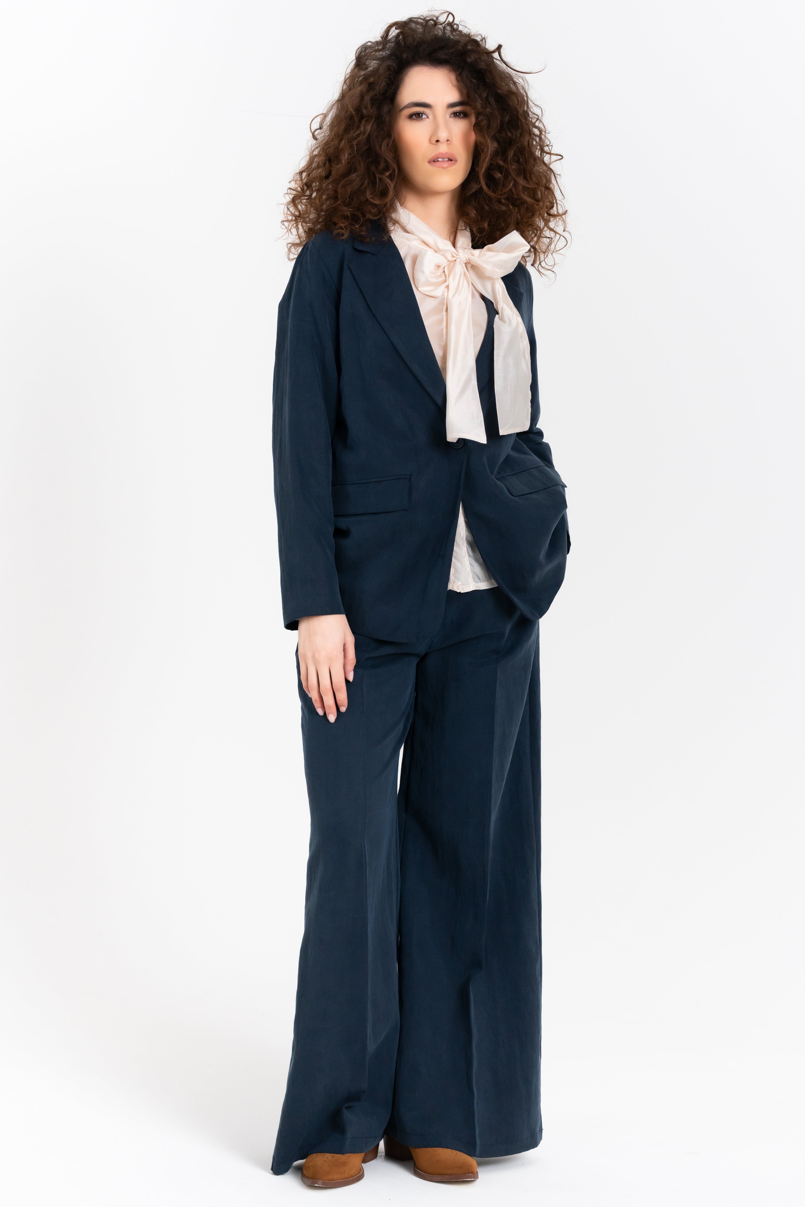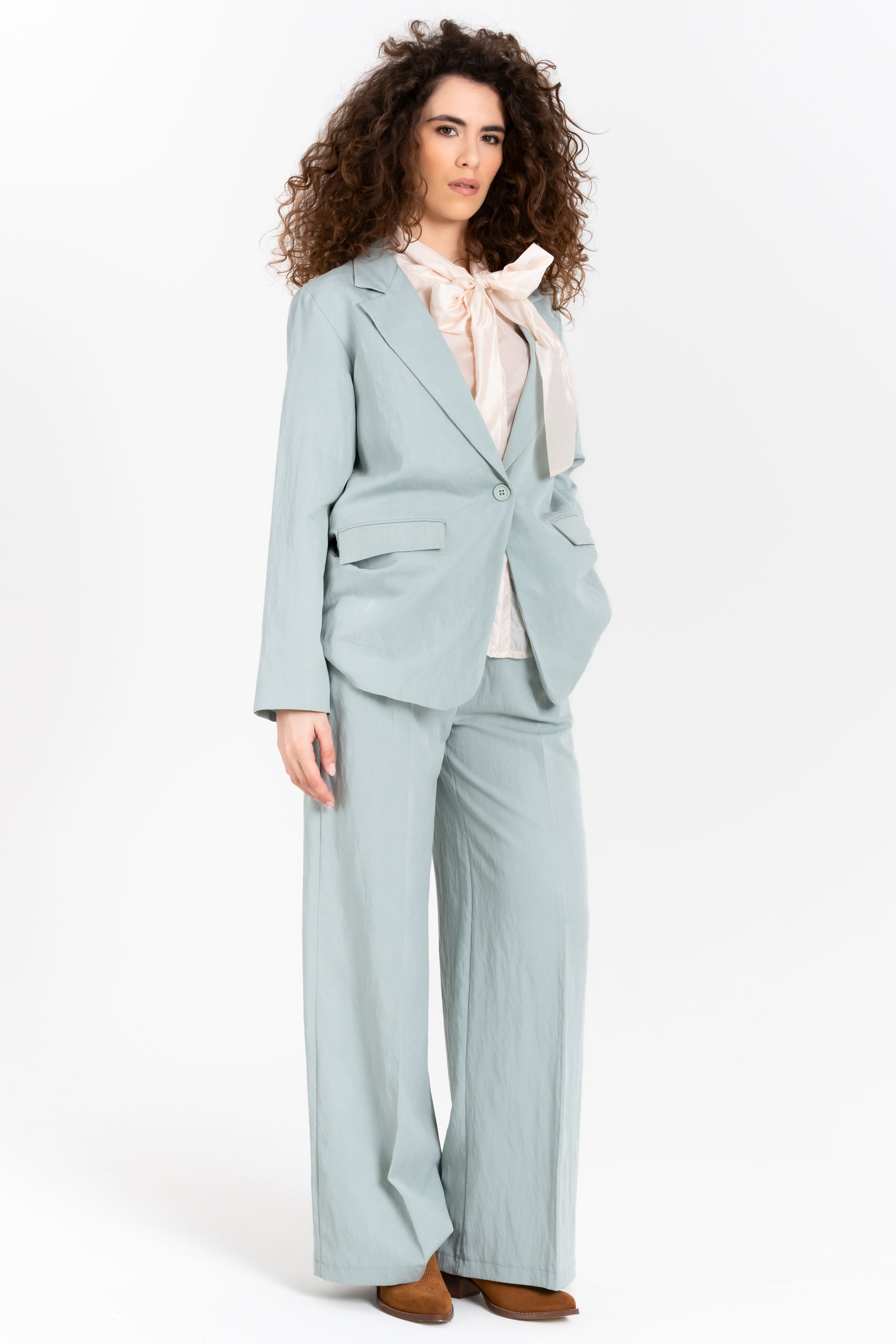 Blazer dal taglio morbido e contemporaneo, realizzata in tessuto leggero manopesca, presenta una linea leggermente over che valorizza la silhouette senza costringerla.