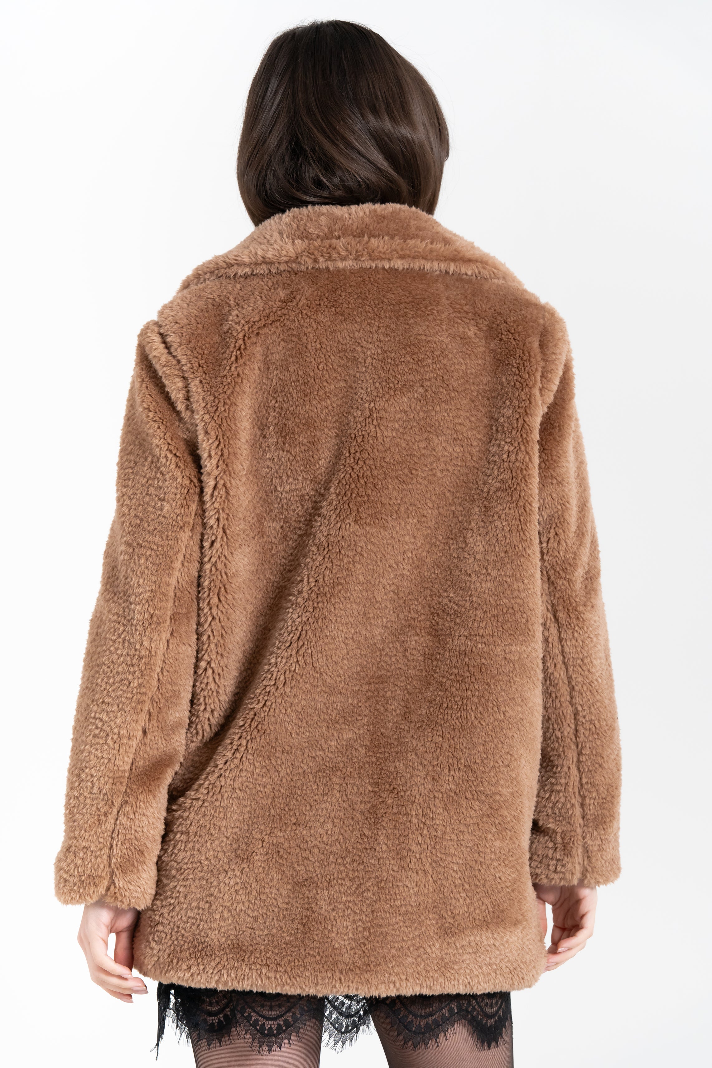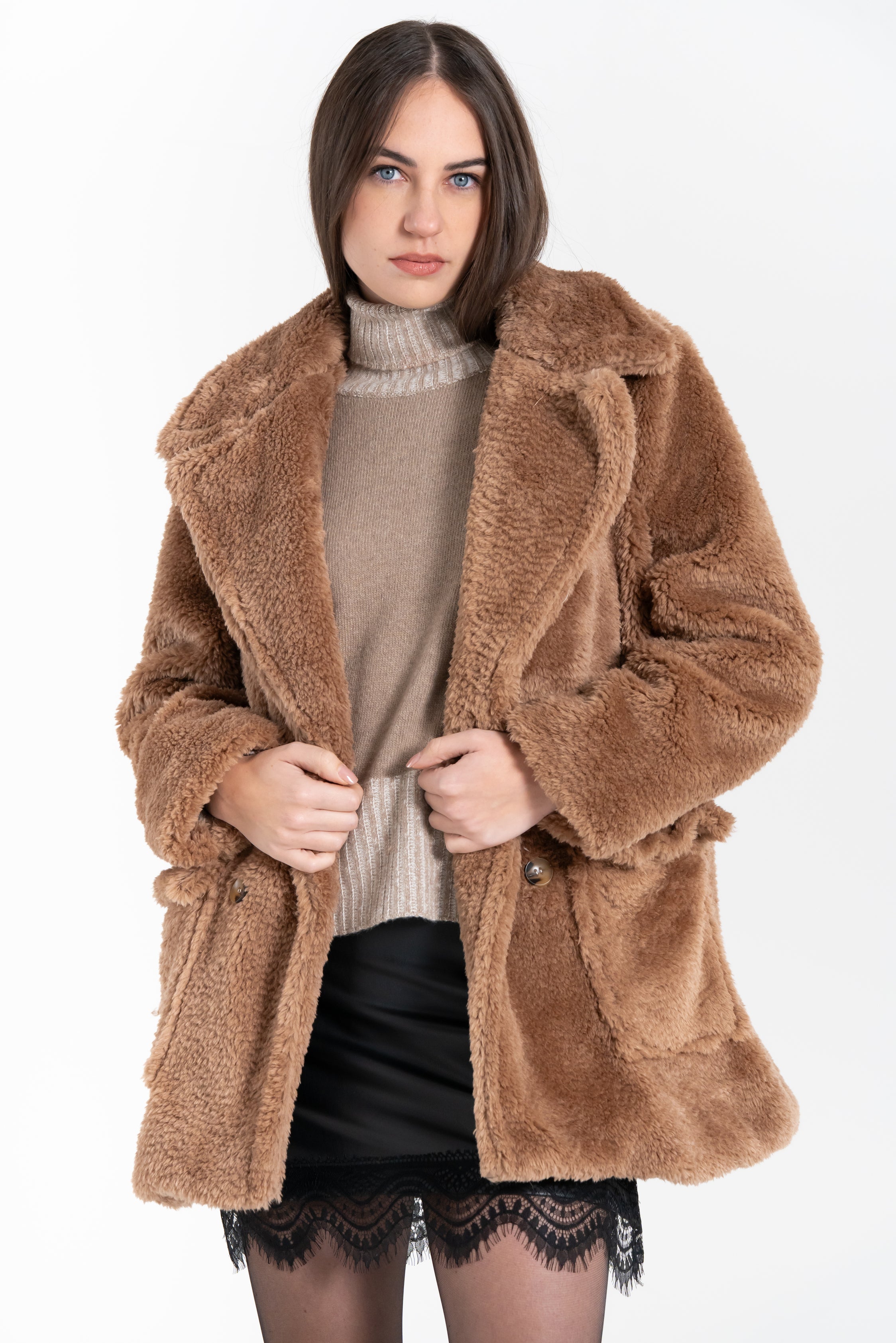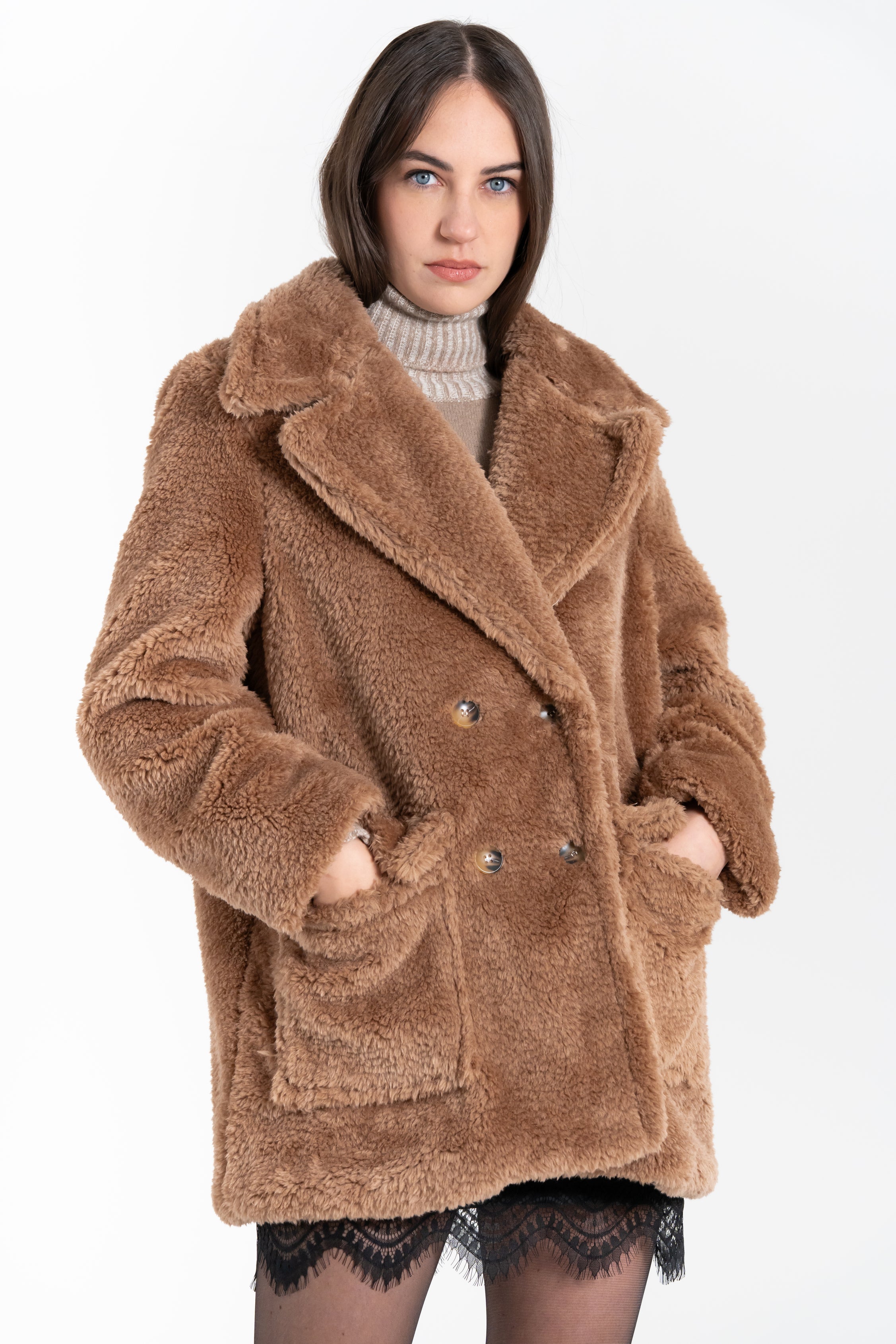 Cappotto in tessuto teddy morbido, modello doppiopetto con rever ampio, tasche applicate frontali e vestibilità leggermente oversize. Lunghezza media, caldo e confortevole, ideale per un look casual ed elegante nella stagione fredda.